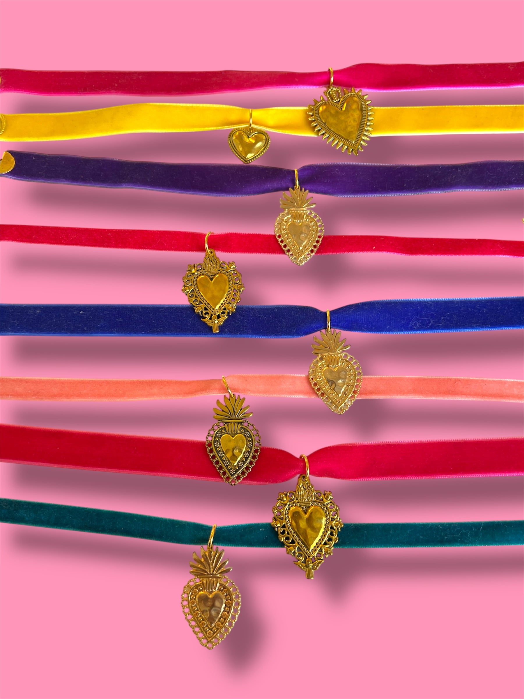 Each necklace is handmade. I thoughtfully picked a velvet ribbon choker to pair with each sacred heart adornment.